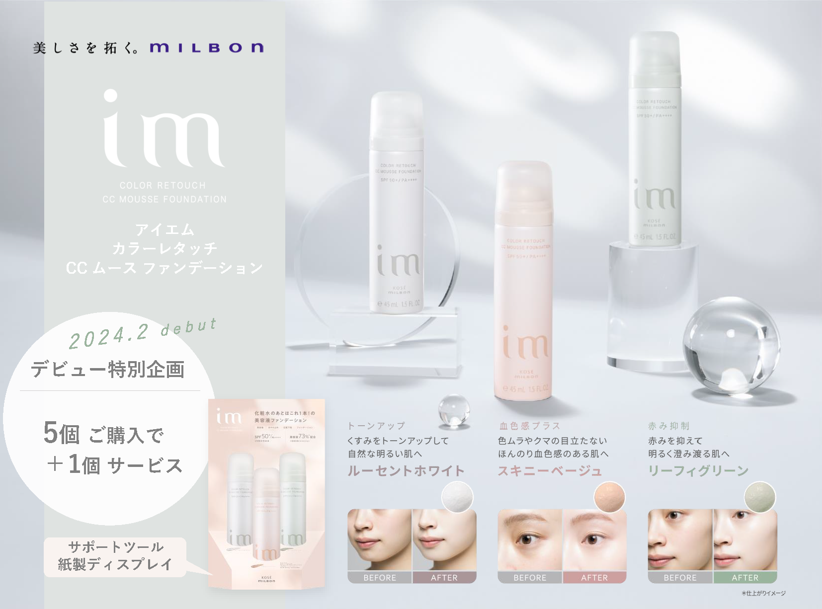 「im(アイエム)」からリリースされる春の新作、ブロウ&ラッシュカラーマスカラとカラーレタッチCCムースファンデーションはお客様の「変えたい」気持ちに寄り添い、サロンスタッフも提案しやすい商品となっています。